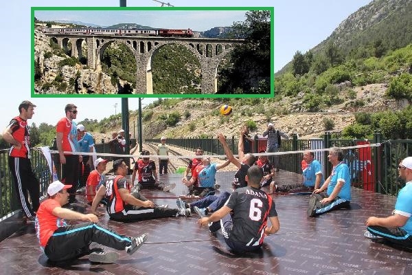 ADANA'nın Karaisalı İlçesi'ndeki tarihi Varda Köprüsü'nde engelliler oturarak voleybol (Paravolley) oynadı.